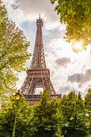 De Eiffeltoren in de zomer. Omkaderd door bomen waar de zon doorheen schijnt. Op de voorgrond een oude straatlantaarn.
