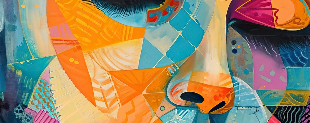 Details: portret, vrouw, modern, kleurrijk, eigentijds, geometrisch, kunst, schilderij, canvas, gezicht