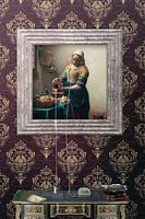 Dit schilderij biedt een eigentijdse twist op het beroemde melkmeisje van Vermeer. Terwijl ze nonchalant melk in een glas schenkt, is haar volledige aandacht gericht op een telefoongesprek. Opvallend is de telefoonkabel die uit het schilderij komt en verbinding maakt met een echte telefoon, waardoor verleden en heden op een unieke manier samenkomen.