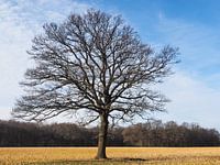 Bladerloze eik in de winter op een akker in de streek Tecklenburg.