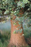 Een schitterende eikenboom toont zijn kleuren in de avondzon