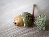 Close up van een eikeltje aan een takje op hout. Mooie bruintinten voor een herfstachtig sfeerbeeld. Past goed in een bruin interieur.