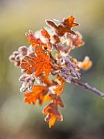 Oranje bruine herfstkleuren van de verdorde bladeren aan een eikenboom op een winterochtend met vorst.