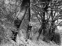 Hoog contrast zwart-Wit foto van eikenbomen in het Zuid-Limburgse heuvelland bij Eys na een sneeuwbui.