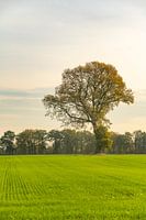 Oude eikenboom in een landbouwveld tijdens de herfst met een rij bomen op de achtergrond.