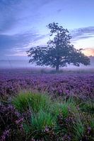 Eikenboom omringd door bloeiende Heideplanten in een heidelandschap tijdens zonsopgang in de zomer in het natuurgebied de Veluwe in Gelderland, Nederland.