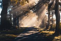 Op een herfstochtend vallen zonnestralen door de bladeren van de oude eikenbomen in het noordelijke Hessische district Kassel.