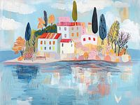 Eiland Huizen | Kleurrijk Huisje aan Water - Op dit schilderij zie je een kleurrijk eiland met vrolijke huizen in verschillende kleuren en boomtoppen die aan de herfst doen denken, perfect voor een zomer tuin indruk.