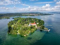 Het eiland Mainau in het Bodenmeer met de aanlegsteiger en het barokke kasteel Mainau, gebouwd tussen 1739 en 1746, daarachter het dorp Litzelstetten en de Bodanrück, die de Untersee van het Überlingenmeer scheidt.