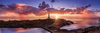 Prachtige kust van het eiland Menorca in de Middellandse Zee met vuurtoren Favaritx voor een prachtig kustlandschap in het warme ochtendlicht.