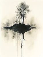 Een minimalistische zwart-wit tekening van een eiland met bomen. Het eiland op een vreemde manier weerspiegeld in het water.