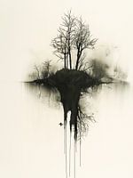 Een minimalistische zwart-wit tekening van een eiland met bomen. Het eiland en de bomen worden op een vreemde manier weerspiegeld in het water.