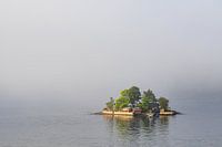 Eiland met mist in de archipel bij Stockholm, Zweden.