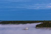 Eilanden in de archipel met mist en baken voor de kust van Stockholm, Zweden.