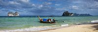 De longtailboot schommelt zachtjes in het ondiepe water, zijn slanke boeg wijst naar de open zee. Het zand eronder is fijn en warm, gemarkeerd door de zachte sporen van de getijden. Het water is kristalhelder, alsof het de hemel probeert te weerspiegelen.