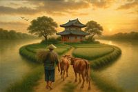Een vredig tafereel waarin een boer samen met zijn twee ossen over een smal pad richting een traditioneel huis loopt, gelegen op een klein eiland in de rivier. De zon zakt langzaam achter de horizon en werpt een warme gouden gloed over het landschap. De rijstvelden glanzen zacht in het licht, terwijl vogels boven de rivier vliegen. Dit beeld ademt rust, eenvoud en verbondenheid met de natuur.