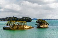 Eilandjes in Matsushima Bay dicht bij Sendai. De eilandjes liggen in aqua blauw water en baden in het gele avondlicht tijdens een bijna volledige bewolkte dag.