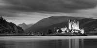 Een weids zwart-wit foto van Eilean Donan Castle. Het kasteel staat op een klein getijdeneiland waar drie zee lochs samenkomen, Loch Duich, Loch Long en Loch Alsh, in de westelijke hooglanden van Schotland. Het schilderachtig kasteel domineert het eiland.