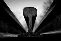 Doordat de foto van onderaf genomen is krijgt het contour van de spoorstaaf een robuust, indrukwekkend aanzien.