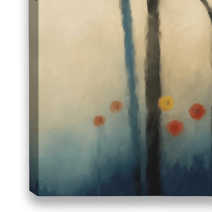 Een gestileerde afbeelding van bomen met ronde, kleurrijke rode en witte bloemen tegen een achtergrond met kleurverloop creëert een grillig boslandschap. Het arrangement en kleurenschema geven het een dromerig, bijna buitenaards gevoel.
