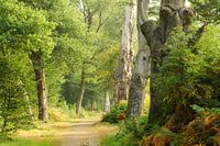 Idyllische en sprookjesachtige scene van oeroude bomen zonder hun bast langs een voetpad aan het einde van de zomer.