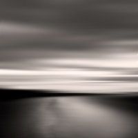 Abstract landschap aan zee, met strand, wolken en avondlicht. Minimalistische fotografie in zwart-wit uit de serie "Dreamscapes".