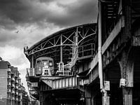 Eindhalte van een metrolijn in New York in een zwart wit foto