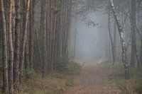 Een wandelpad in het bos bij Otterlo, Gelderland. Het einde van het pad verdwijnt in de mist. Genomen op een vroege ochtend.