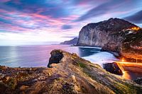 Een eindeloos uitzicht over de noordelijke kust van het mooie eiland Madeira. Deze foto werd genomen tijdens de zonsopkomst waarbij er prachtige tinten paars en roze in de wolken zichtbaar waren.