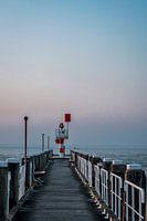 Deze rustige foto vangt het eindeloze uitzicht over zee vanaf een verlaten pier, met een rood-witte vuurtoren aan het einde. De avondschemering hult de lucht in zachte pastelkleuren, terwijl de vuurtoren en lantaarns subtiel verlicht zijn. Het contrast tussen de houten planken en de heldere, eenvoudige kleuren van de vuurtoren creëert een harmonieuze balans. Dit beeld straalt een gevoel van eenzaamheid en rust uit en is perfect voor wie geïnspireerd raakt door de serene sfeer van kustlandschappen en maritieme symboliek.