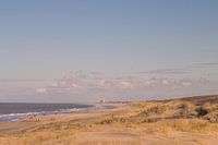 Een weids panorama waarbij de natuurlijke contouren van de duinen de kijker meenemen langs het strand. Het zachte helmgras op de voorgrond en de verre bebouwing aan de horizon vertellen het verhaal van ons unieke landschap tussen land en water.