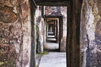 Een lange gang van beton met ingangen zonder deur. Het daglicht komt van opzij en werpt schaduwen. Het beton valt langzaam uit elkaar en heeft sporen van groen mos.