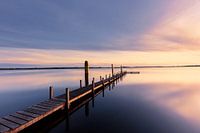 Foto van een hele lange steiger in rustig water. Er zijn wolken en glad water. De wolken worden weerspiegeld in het water. De foto is gemaakt bij Surfstrand belterwijde, juli 2022