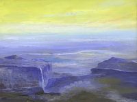 Dit schilderij vangt de essentie van ongerepte natuur in een indrukwekkend landschap. De blik van de kijker gaat over een schilderachtig berglandschap dat zich uitstrekt van intens geel in de lucht tot diep blauw in de verte. Deze kleurovergangen weerspiegelen de overgang van een zonovergoten gebied naar een diepere, mysterieuzere…