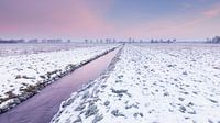 Ik houd van de kleuren van de vroege winter morgen in zacht blauw en roze tonen voor zonsopkomst. Ik houd van de sneeuw en van het stromende water. Ik houd van de rust van het eindeloze landschap.