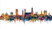 In deze artistieke interpretatie van Eindhoven smelten werkelijkheid en fantasie samen tot een indrukwekkend geheel. Het kleurenpalet varieert van warme aardetinten tot fel oranje en diep blauw, die harmonieus in elkaar overgaan. Het aquareleffect onderaan de foto creëert een dromerige sfeer, alsof de stad langzaam in kleur versmelt. De architectuur toont de karakteristieke mix van oud en nieuw in Eindhoven - gotische kerktorens staan naast moderne kantoorgebouwen, terwijl kleurrijke woongebouwen de diversiteit van de Nederlandse bouwcultuur weergeven. De kunstenaar heeft gekozen voor een impressionistische benadering, waarbij hij de stemming en sfeer van de stad vastlegt in plaats van zich te richten op fotografische nauwkeurigheid. De levendige kleuren en vloeiende stijl maken dit werk tot een perfect voorbeeld van hedendaagse stadskunst die zowel decoratief als emotioneel aantrekkelijk is.