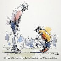 Met losse penlijnen en spaarzame aquarel vangt het werk het geladen stiltemoment vlak vóór het startschot: de menigte vervaagt, het oranje shirt en de rode schoenen trekken de blik naar het gesprek.