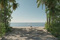 Einzelne Badeliege und Sonnenschirm in einem verlassenen Strandabschnitt und hinter einer leuchtend grünen Allee coller tropischen Pflanzen und Bäume.