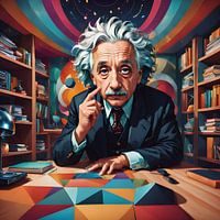 Dit meeslepende digitale kunstwerk brengt hulde aan een van de grootste geesten van de twintigste eeuw: Albert Einstein. De afbeelding is rijk aan kleur en vol detail, waarbij surrealisme en abstractie samensmelten tot een expressief portret dat zowel de intellectuele als de speelse kant van Einstein belicht. Zijn karakteristieke wilde haar en diepzinnige blik worden gevangen in een levendige compositie die de toeschouwer uitnodigt tot contemplatie en bewondering.