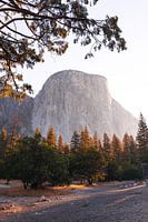 El Capitan in Yosemite National Park verlicht door de warme zon tijdens een zonsopgang in augustus.
