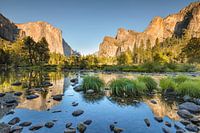 El Capitan weerspiegeld in de Merced River, Yosemite National Park, Californië, VS.