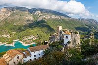 Een prachtig Spaans plaatje: het dorpje El Castell de Guadalest in de provincie Alicante. De toren met kantelen die op de rotsen staat, is een restant van het Castillo de la Alcozaiba, een fort dat moslims gebouwd hebben in de 11e eeuw. De witte toren met het oranje dak is de klokkentoren van Guadalest.