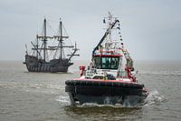 Sleepboot Waterland van Wagenborg en replica van Spaans galjoen El Galeón Andalucía met de sail-in van DelfSail 2024 onderweg naar Delfzijl.