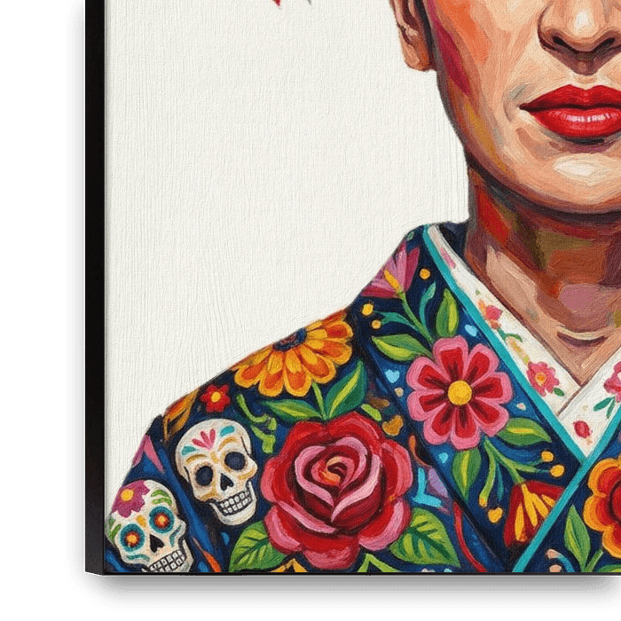 Dit portret combineert de klassieke Mexicaanse folklore met een moderne, grafische pop-art stijl die direct de aandacht trekt in elk interieur.