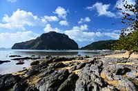 El Nido, de parel aan de kroon van het eiland Palawan in de Filippijnen, is een strandparadijs waar de natuur ongerept lijkt. Op de achtergrond rijzen groene heuvels majestueus op en vormen een opvallend contrast met het turquoise water van de zee. Het landschap wordt onderbroken door een paar traditionele boten die zachtjes voorbij drijven en een vleugje leven toevoegen aan dit vredige tafereel.