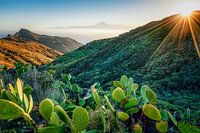 Het gebergte aan de kust van Hermigua wacht weer ongeduldig totdat de klimmende zon de top bereikt om het hele landschap in het zonlicht te doen baden.