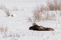 Eland ( Alces alces ), jonge stier eland rustend in de sneeuw, in de natuur, wildlife, Yellowstone NP, USA.