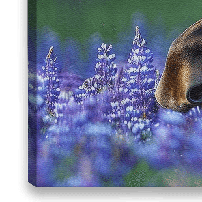 De eland ligt ontspannen, met zijn ogen gesloten en zijn majestueuze gewei prominent in beeld. De paarse bloemen, die de eland omringen, creëren een harmonieuze en visueel aantrekkelijke compositie. Het…