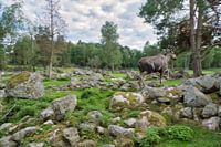 Eland op een groene weide in Scandinavië. Koning van de bossen in Zweden. Grootste zoogdier van Europa. Dierenfoto