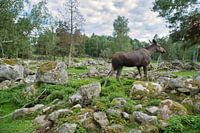 Eland op een groene weide in Scandinavië. Koning van de bossen in Zweden. Grootste zoogdier van Europa. Dierenfoto